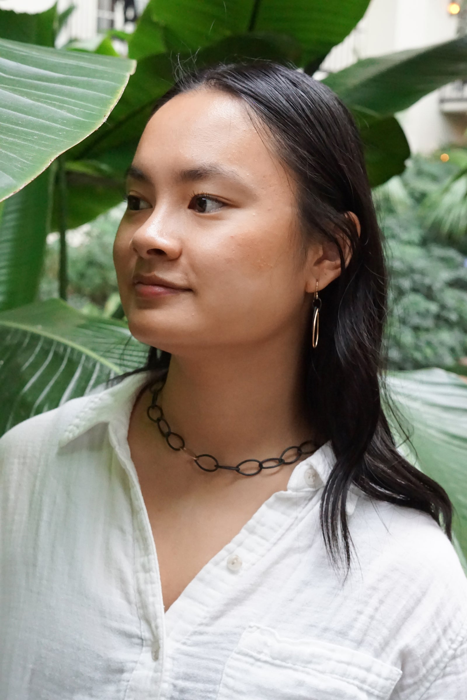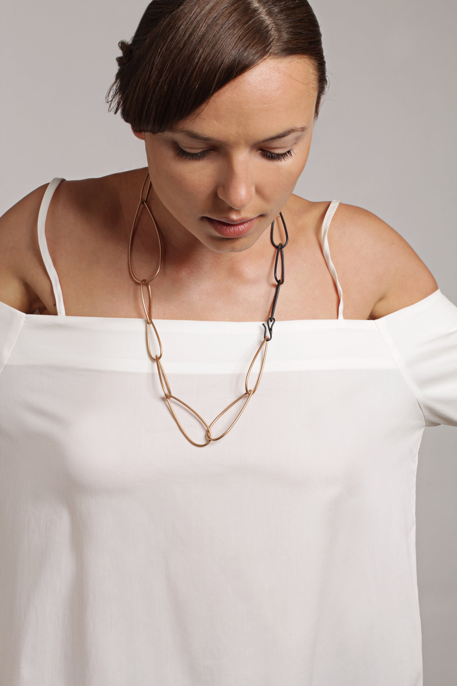 This necklace creates a statement through the simple teardrop shapes and beautiful lavender gray color, with lots of movement and a length that is just right for my style. I’m so happy to have it, after admiring Meagan‘s designs for several years!
