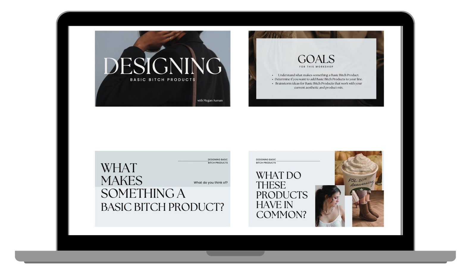 The Designing Basic Bitch Products workshop is just under an hour long. The Finding Your Niche Bitches workshop is about forty-five minutes long. You can work through the process again and again and revisit the videos any time you like.
