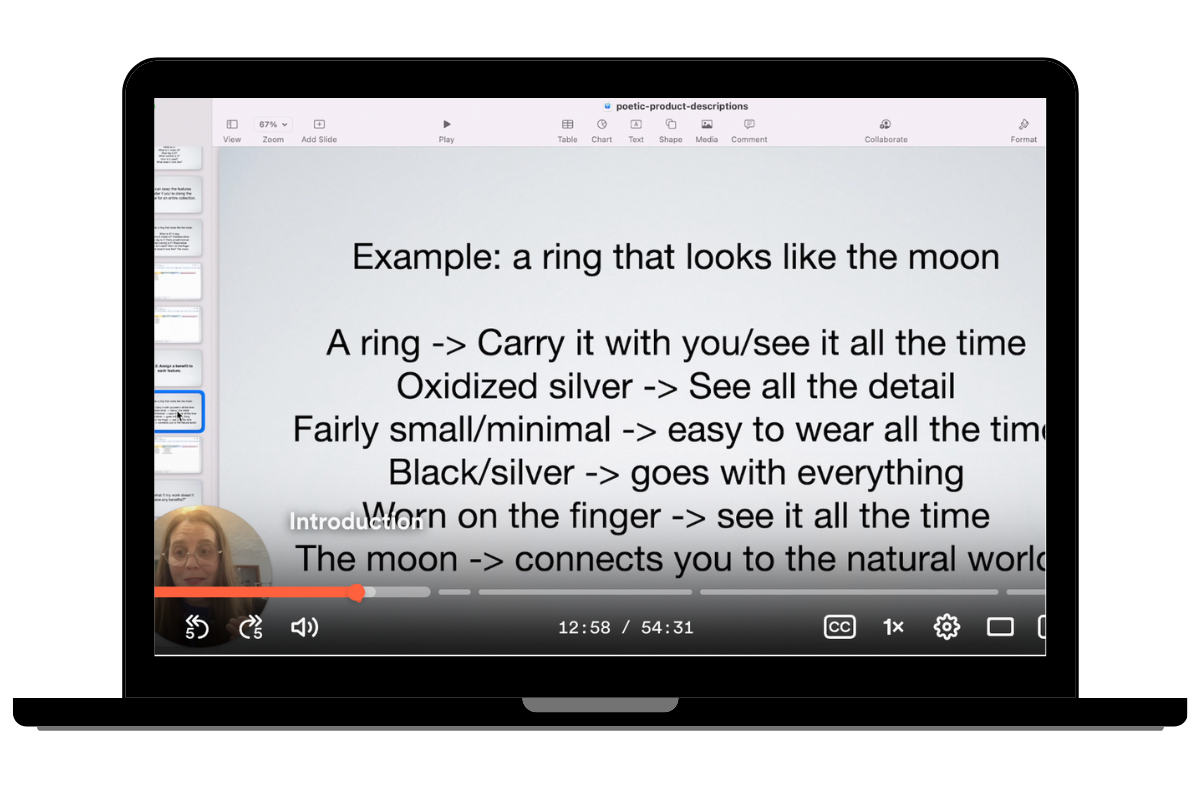 Poetic Product Descriptions is for any artist, maker, or designer looking to sell their art, craft, or handmade products online. This includes one-of-a-kind work and production.