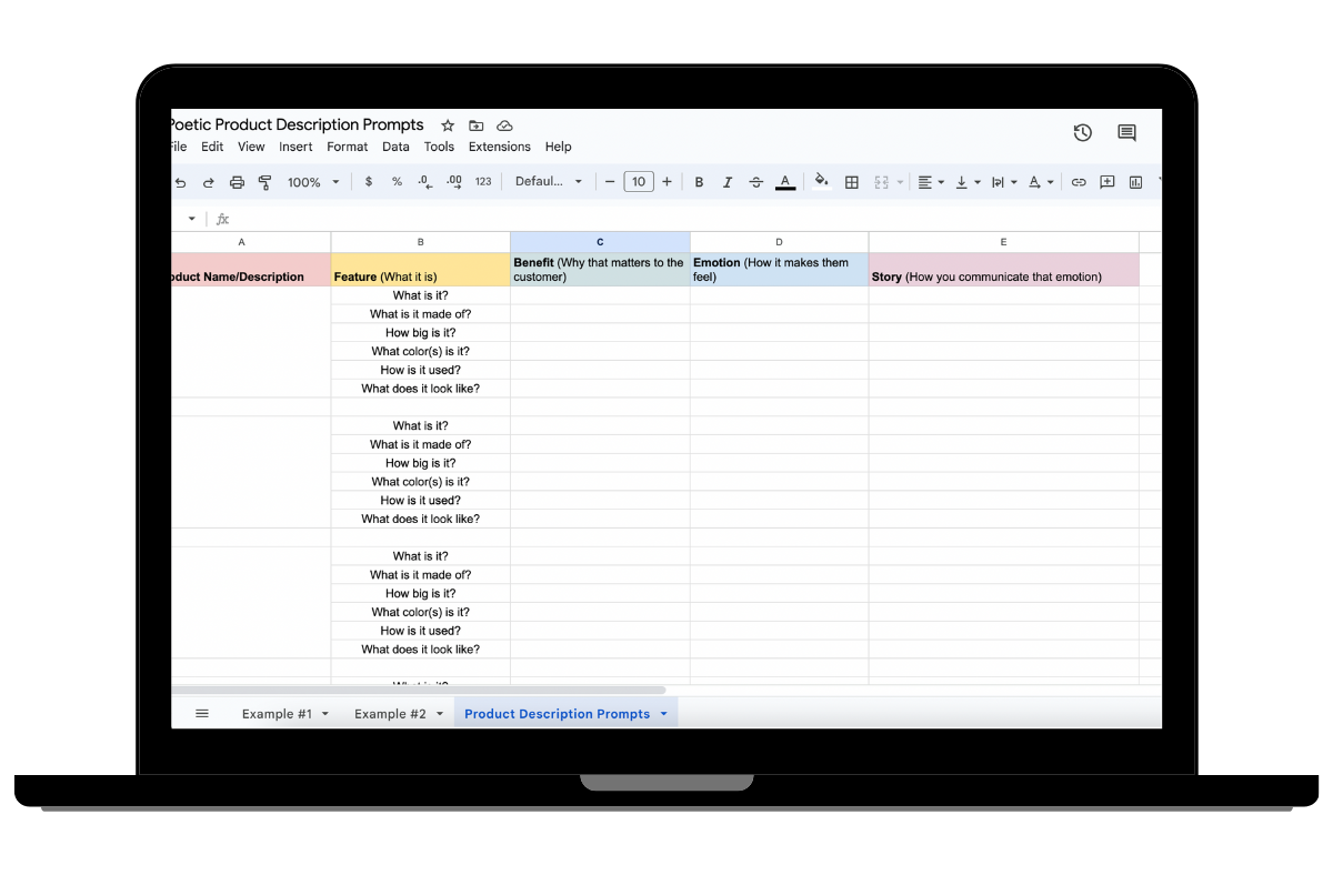 Use the customizable Google Sheet to craft your product descriptions.